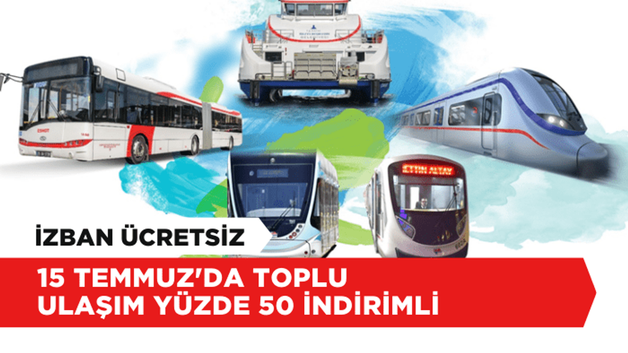 İzmir Büyükşehir Belediyesi'ne bağlı ESHOT, İZULAŞ, İZTAŞIT, İZDENİZ, İzmir Metrosu ve İzmir Tramvayı'nda 15 Temmuz Demokrasi ve Milli Birlik Günü'nde yüzde 50 indirimli ulaşım sağlanacak.
