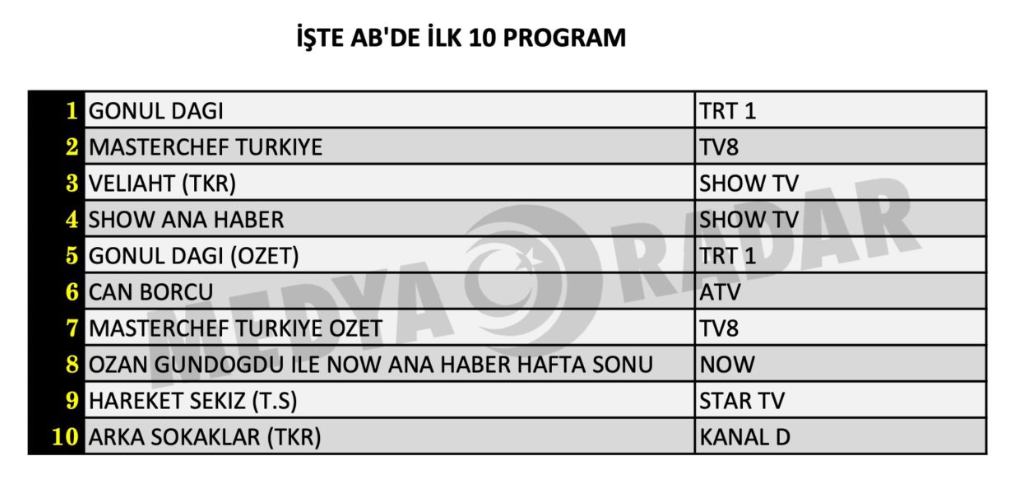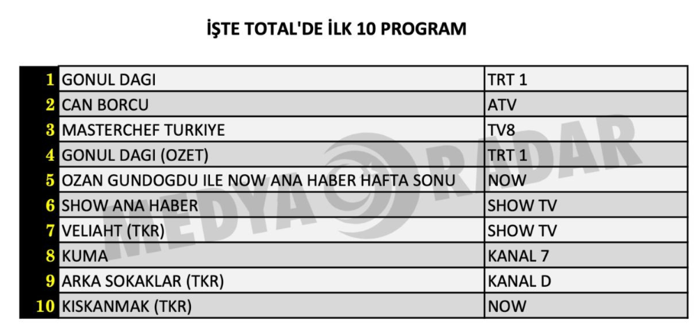 20 Eylül Cumartesi günü ekranlara gelen yapımların reyting sonuçları belli oldu. Kıskanmak, Gönül Dağı, Can Borcu, Veliaht, Arka Sokaklar, Hareket Sekiz ve MasterChef Türkiye’nin ekrana geldiği günde kazanan yapım da belli oldu. İşte 20 Eylül Cumartesi reytinglerine dair tüm detaylar...