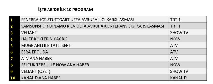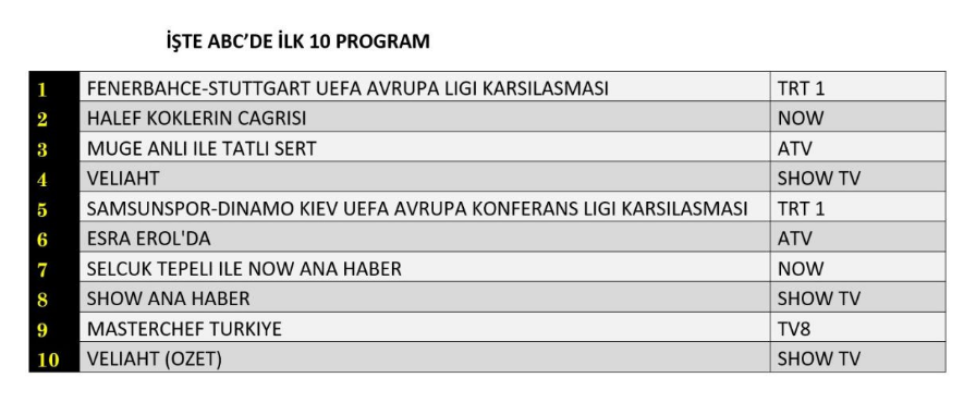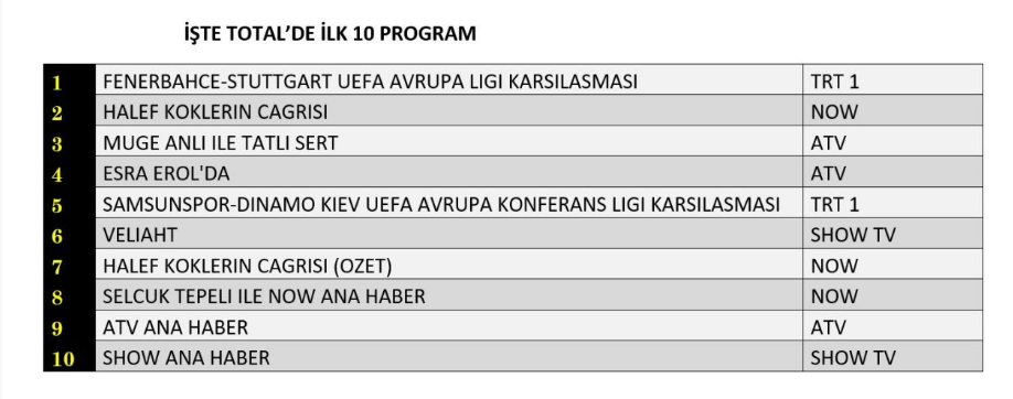 23 Ekim tarihinde ekranlara gelen yapımların reyting sonuçları belli oldu. UEFA Avrupa Ligi heyecanının damga vurduğu günde, Fenerbahçe-Stuttgart karşılaşması tüm kategorilerde zirveye yerleşti.