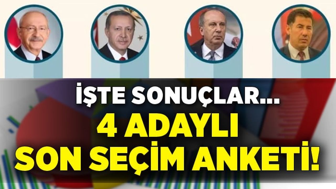 Yapılan araştırmada, "Bu pazar seçim olsa hangi adaya oy verirsiniz?" sorusu yönetildi. Katılımcıların yüzde 53.1'i Millet İttifakının adayı Kemal Kılıçdaroğlu'nu seçerken, yüzde 42,3'ü de Cumhurbaşkanı Erdoğan'ı destekledi. 4 adaylı seçim anketinde 3. sırada Memleket Partisi'nin cumhurbaşkanı adayı Muharrem İnce yüzde 3.1'le destek görürken, Ata İttifakı'nın adayı Sinan Oğan yüzde 1.5 oranında destek gördü.