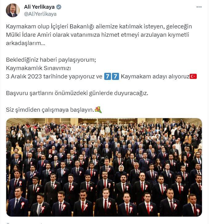 Bakan Yerlikaya, sosyal medya hesabından yaptığı açıklamada, "Kaymakam olup İçişleri Bakanlığı ailemize katılmak isteyen, geleceğin mülki idare amiri olarak vatanımıza hizmet etmeyi arzulayan kıymetli arkadaşlarım... Beklediğiniz haberi paylaşıyorum; kaymakamlık sınavımızı 3 Aralık 2023 tarihinde yapıyoruz ve 77 kaymakam adayı alıyoruz. Başvuru şartlarını önümüzdeki günlerde duyuracağız. Siz şimdiden çalışmaya başlayın" dedi.