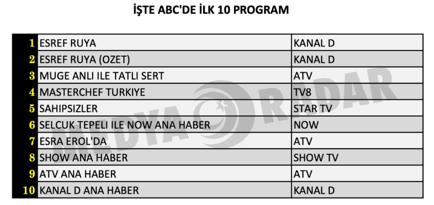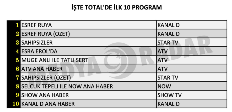 9 Ekim Perşembe yayınlanan dizi ve programların reyting sonuçları belli oldu. Eşref Rüya, Sahipsizler, Can Borcu, Veliaht, Gönül Dağı, Ben Leman ve MasterChef Türkiye’nin ekrana geldiği günde kazanan yapım da belli oldu.