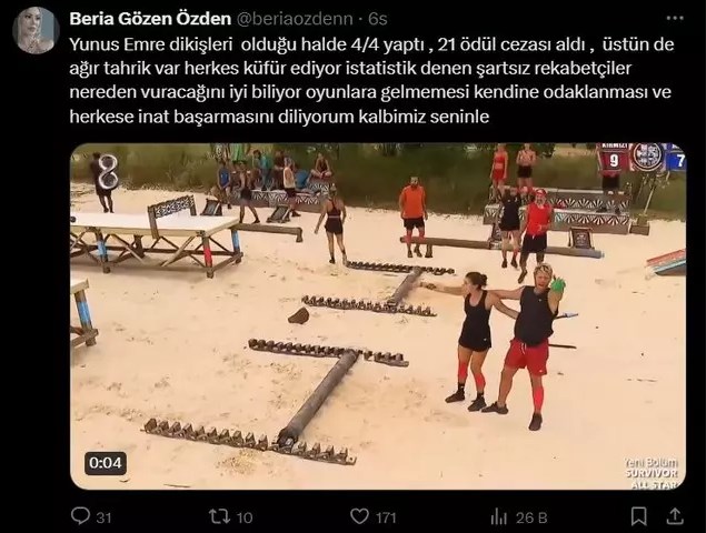 "Yunus Emre dikişleri olduğu halde 4/4 yaptı, 21 ödül cezası aldı, üstüne de ağır tahrik var herkes küfür ediyor istatistik denen şartsız rekabetçiler nereden vuracağını iyi biliyor, oyunlara gelmemesi, kendine odaklanması ve herkese inat başarmasını diliyorum kalbimiz seninle."