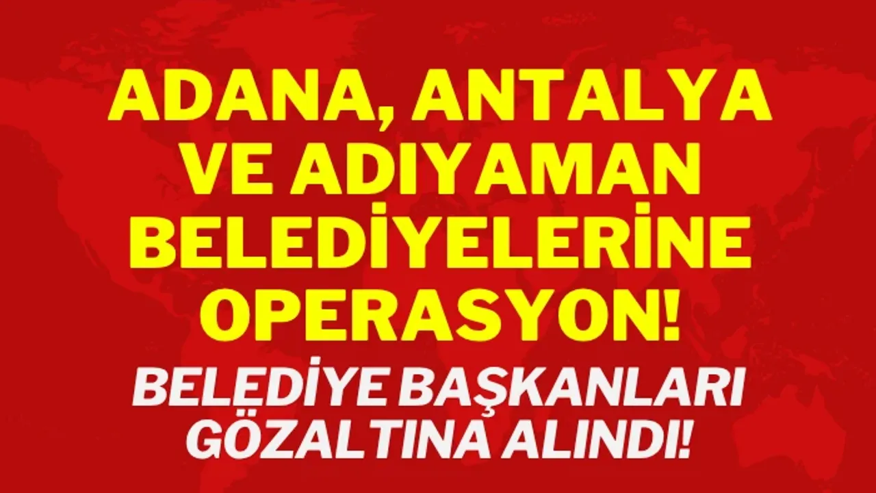 İstanbul Cumhuriyet Başsavcılığı'nın yürüttüğü 'yolsuzluk' soruşturması kapsamında; Adana Büyükşehir Belediye Başkanı Zeydan Karalar ve Adıyaman Belediye Başkanı Abdurrahman Tutdere gözaltına alındı. Karalar ve Tutdere'nin İstanbul'a götürüldüğü öğrenildi. Gelen son dakika bilgisine göre Antalya Büyükşehir Belediye Başkanı Muhittin Böcek de gözaltına alındı