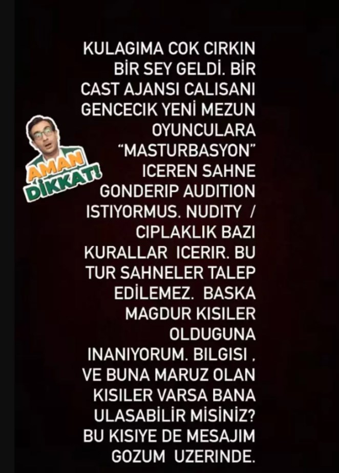 "Kulağıma çok çirkin bir şey geldi. Cast ajansı çalışanı gencecik yeni mezun oyunculara mastürbasyon içeren sahne gönderip audition (deneme çekimi) istiyormuş. Çıplaklık bazı kurallar içerir. Bu tür sahneler talep edilemez."