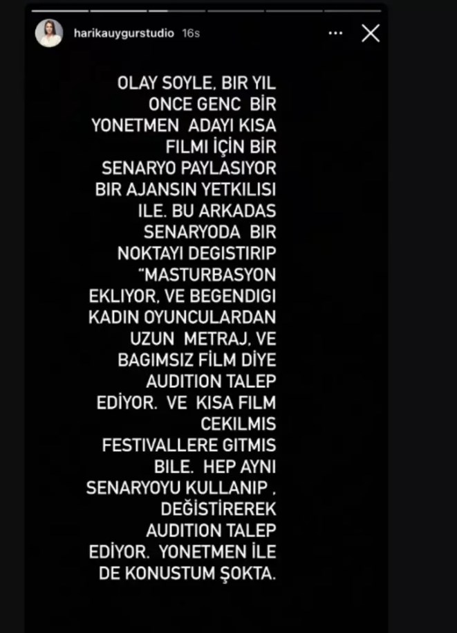 Dizi ve sinema sektöründe bir iddia gündeme bomba gibi düştü. Oyuncu yönetmeni Harika Uygur sosyal medya hesabından iğrenç bir olayı gündeme getirdi.