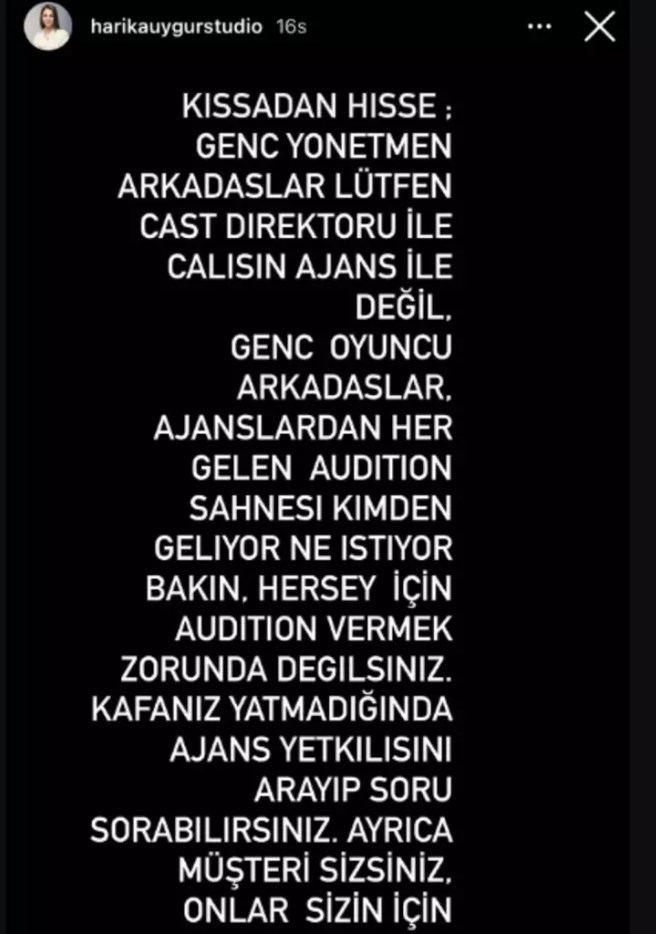 Bir ajans çalışanının bazı oyunculara mastürbasyon sahneleri atarak audition istediğini iddia eden Uygur, şöyle paylaştı: