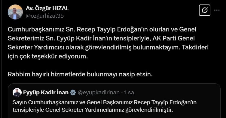 Özgür Hızal da yaptığı paylaşımla, "Cumhurbaşkanımız Sn. Recep Tayyip Erdoğan’ın olurları ve Genel Sekreterimiz Sn. Eyyüp Kadir İnan'ın tensipleriyle, AK Parti Genel Sekreter Yardımcısı olarak görevlendirilmiş bulunmaktayım. Takdirleri için çok teşekkür ediyorum." dedi.