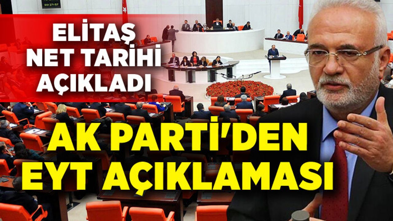 Genel Kurul gündemine değinen Elitaş, "Birinci sıradaki gündemimiz, emeklilikte yaşa takılanlar; EYT ile ilgili düzenleme olacak. 4 maddelik kanun teklifi. Eğer siyasi parti grupları katkı sağlarlarsa yarın bitiririz, partilerin grup önerisi olursa da çarşamba günü EYT nihayete erer, diye düşünüyorum" açıklamasında bulundu.