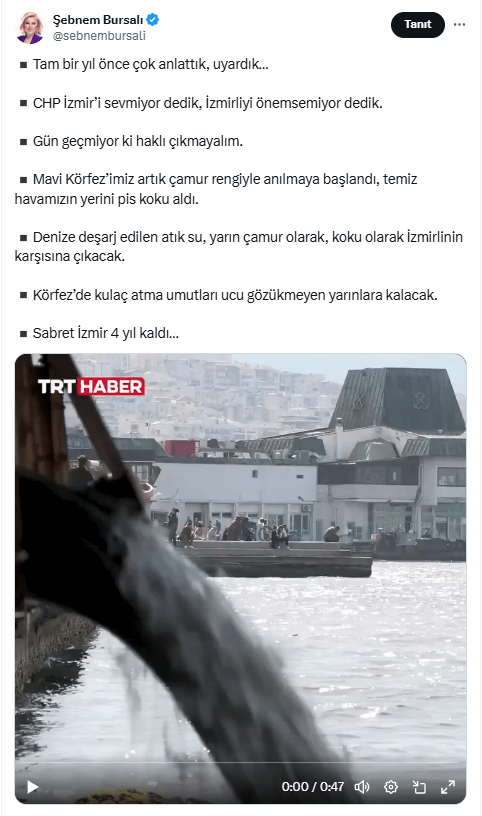 AK Parti İzmir Milletvekili Sayın Şebnem Bursalı, sosyal medya hesabından İzmir Büyükşehir Belediyesi’nin İzmir Körfezi’ne atık su deşarj etmesine yönelik eleştirilerde bulundu.