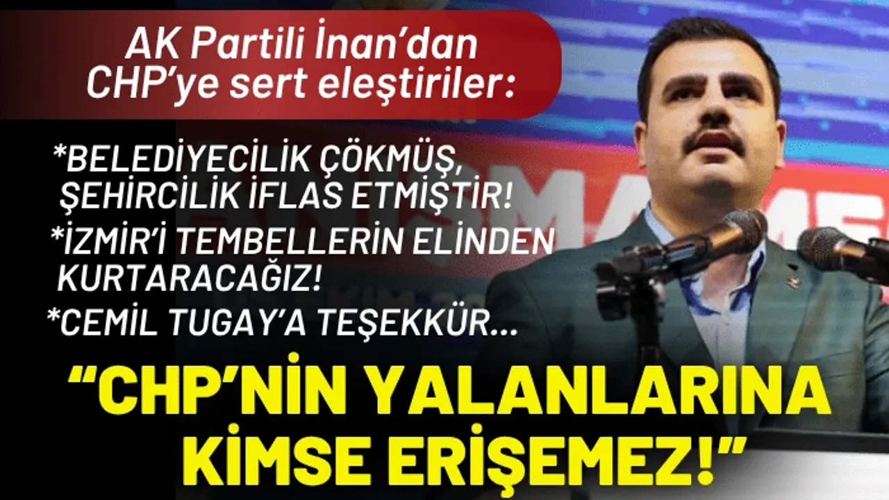 İnan, "Son 200 yılın bütün yalancılarını, bütün yalanlarını bir araya getirin; CHP’nin İzmir’de söylediği yalanlara yine de erişemezler! Çünkü CHP’nin İzmir’deki siyaseti, bir hizmet yarışı değil, bir yalan yarışıdır! Ne söylerlerse tersi çıkar ne vaat ederlerse boşa çıkar. Birgün “Kooperatifte dolandırıcılık yok” derler; ertesi gün kendi belediye başkanları çıkar, “evet var” diye itiraf eder. Birgün çöp tesislerini bakanlık kapattı der. Ertesi gün belediye başkanları çıkar mahkeme kapattı. Mahkemeye rağmen bakanlık bize destek oldu der. Bir gün “Çöpler Toplanıyor” derler; ertesi gün izmirliler çöp dağlarıyla, kokuyla, mikropla baş başa bırakılır. Bir gün “Belediyemiz Güçlü” derler; ertesi gün SGK borçlarını ödeyemez, işçinin maaşını veremez hale gelirler. Evet… CHP’nin İzmir’de tek bir başarısı vardır: Yalan Üretmek! Ama İzmirliler artık bu yalana da bu maskaralığa da prim vermeyecek! Çünkü İzmirli, hizmetin kimden geldiğini deyalanın kimden çıktığını da görüyor! Çünkü İzmirli, eserle yalanı, hizmetle boş sözü ayırt ediyor! Ve İzmirli biliyor ki; Çözüm AK Parti’dir, umut AKParti’dir, gelecek AKParti’dedir." dedi.