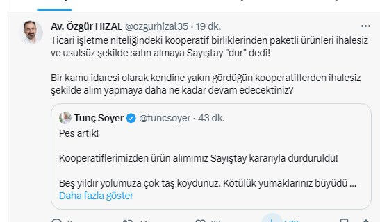 AK Parti İzmir Büyükşehir Belediye Meclisi Grup Başkan Vekili Özgür Hızal, sosyal medya hesabından paylaşım yaparak sayıştayın kararına itiraz eden Tunç Soyer'i eleştirdi.