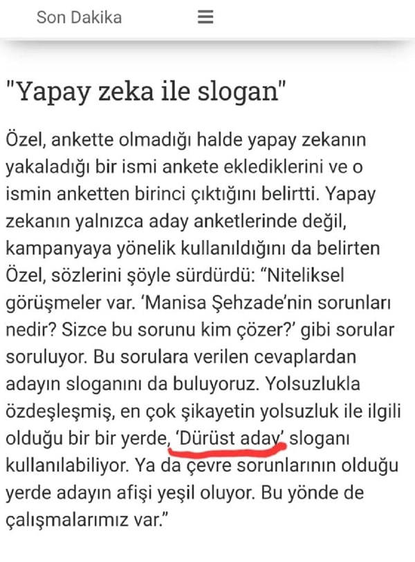 CHP'nin İzmir'de aday ve slogan belirlerken yapay zekaya sordukları soruların doğru olduğunu ama aldıkları yanıtların kendilerini işaret ettiğini göremediklerini belirten AK Parti İzmir İl Başkanı Bilal Saygılı, konuya ilişkin şunları söyledi; "Halka sorulası gerekeni, yapay zekaya sormuşlar. Hadi sordular, yapay zekâ mucizesini yok sayacak değiliz. Ama; aldıkları yolsuzluk şikâyeti olan yerlerle ilgili yanıtları hiç üstlerine alınmadan açıklama yapıyorlar. Maharetmiş gibi de "doğru-dürüst" sloganını buna göre belirlediklerini söylüyorlar. Şaka gibi gerçekten. Bu ne demek? Kendilerinin İzmir'i, Büyükşehir Belediye Başkan Adayları Cemil Tugay'ın son 5 yıl Karşıyaka'yı yönettiği yerde 'yolsuzluk' şikâyeti var demek. Doğru, Dürüst tarifine kendileri yüzünden ihtiyaç duymuşlar demek. Bu ne demek? Tugay'ın selefi Tunç Soyer, daha önceki başkanları Aziz Kocaoğlu 'doğru-dürüst değildi' demek. CHP'nin İzmir'de aynaya bakma alışkanlığı zaten hiç yoktu; yapay zekâ onlara acı gerçeği sunmuş, bu kez de üstlerine hiç alınmamışlar."