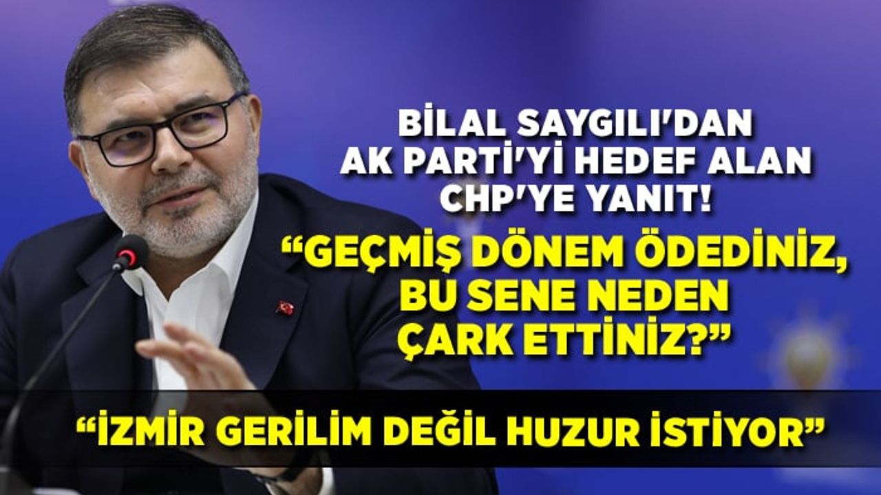 AK Parti İzmir İl Başkanı Bilal Saygılı, İzmir Büyükşehir Belediye memurlarının eyleminde, AK Parti'yi hedef alan CHP kanadına, ''Geçmiş dönem toplu iş sözleşmelerinde SDS olarak tabir edilen ek ödemeleri, belirlenen tavan rakamın üzerinde ödeyen Büyükşehir Belediyesi bugün yan çiziyor. Düne kadar yasal mevzuatı hiçe sayarak ilgili sendikayla masada anlaşıp SDS ödemelerini yapan Büyükşehir Belediyesi ne oldu da bugün bu kararından çark etti? Kendi memuruna ödeme yapamayan, geçen sene ilgili mevzuatı aşarak verdiği ödemeleri bu sene vermemek için AK Parti’yi hedef alan siyasi manevra beyhudedir." dedi.