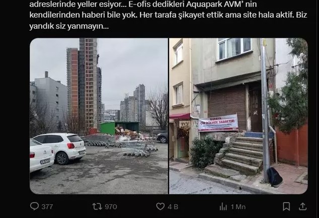 Sosyal medya hesabından uyarılarda bulunan Varol, "Dolandırıldık… Depo ve ofis adreslerinde yeller esiyor… E-ofis dedikleri Aquapark AVM’nin kendilerinden haberi bile yok. Her tarafa şikayet ettik ama site hâlâ aktif. Biz yandık siz yanmayın…" dedi.