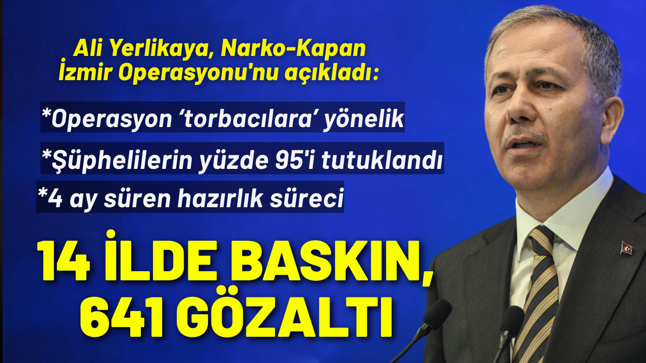 Elde edilen bilgiler sonrası dün sabah şafak sökmeden eş zamanlı operasyon başlattıklarını söyleyen Bakan Yerlikaya, "Uyuşturucuyla savaşımız, çok katmanlı ve çok boyutlu olarak kararlılıkla devam ediyor. Uyuşturucu suç örgütü elebaşından, yöneticisinden torbacısına kadar tedarik zincirinin her halkasını tek tek kırıp atacak ayrı ayrı operasyonlar düzenliyoruz. Sadece uyuşturucu maddeleri yakalamakla kalmıyor, bu organize suç faaliyetlerinin tedarik ağlarını çökertiyor ve suç gelirlerine darbe vuruyoruz. Torbacılar, uyuşturucu suç örgütlerinin sahadaki eli, kolu, gözü, kulağıdır. Bunlar aracılığıyla sokaklara iniyorlar. İşte Narkokapan operasyonlarıyla biz, bu zehir tacirlerinin bir bakıma elini kolunu kesiyoruz. Hareket kabiliyetlerini yok ediyoruz. Yani uyuşturucu ağının sinir uçlarını hedef alıyor ve pazarlama ağlarını parçalayıp atıyoruz. Hava ve deniz unsurlarımızca da desteklenen Narkokapan İzmir operasyonuna 4 bin 500 polis, 956 ekip ve 8 özel eğitimli narkotik dedektör köpeği katıldı. İzmir merkezli olmak üzere 14 ilde, 608 ayrı adrese eş zamanlı operasyon gerçekleştirdik ve 641 şahıs gözaltına alındı. Narkokapan operasyonlarıyla yakaladığımız torbacıların tutuklanma oranı yüzde 95" ifadelerini kullandı.