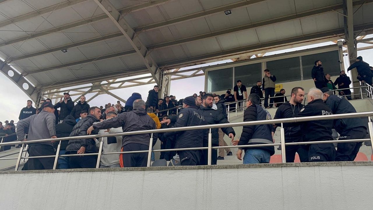 Maçın ikinci yarısında ise tansiyon tribünlere taşındı. Hakem kararları nedeniyle iki takım taraftarları arasında sözlü tartışma başladı. Karşılıklı küfürleşmenin ardından tribünlerde sandalye, taş parçaları ve su şişeleri atıldı. Polis ekipleri birbirine giren taraftarlara biber gazıyla müdahale etti. Tribünlerde çıkan olaylar nedeniyle stadyuma takviye polis ekipleri sevk edildi. Biber gazından etkilenen bazı taraftarlara, stat dışında hazır bekleyen ambulanslarda sağlık ekipleri tarafından müdahale edildi. Polis ekipleri tarafından 1 taraftar gözaltına alındı. Olaylarla ilgili inceleme başlatıldı.