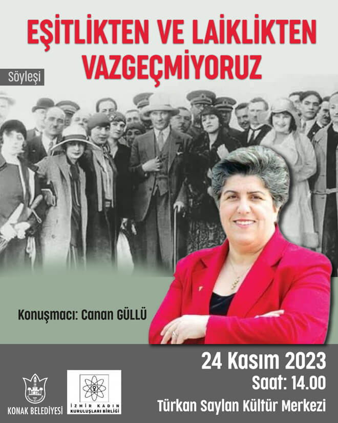 Kadına Yönelik Şiddete Karşı Uluslararası Mücadele Günü etkinlikleri kapsamında, Türkiye Kadın Dernekleri Federasyonu Başkanı Canan Güllü, "Eşitlikten ve Laiklikten Vazgeçmiyoruz" başlığı altında bir söyleşi gerçekleştirecek. 24 Kasım tarihinde yapılacak söyleşi Türkan Saylan Kültür Merkezinde saat 14.00'te başlayacak. Söyleşi öncesi ise Türkan Saylan Kültür Merkezi önünde, Konak Belediye Başkanı Abdül Batur ve 109 kadın sivil toplum kuruluşu temsilcisinin katılacağı bir basın açıklaması gerçekleştirilecek.