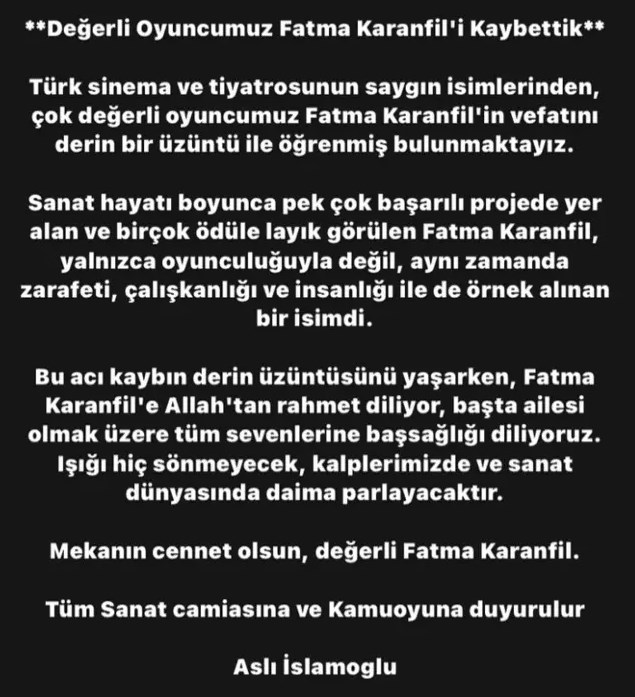 Türk sinema ve tiyatrosunun saygın isimlerinden, çok değerli oyuncumuz Fatma Karanfil'in vefatını derin bir üzüntü ile öğrenmiş bulunmaktayız. Sanat hayatı boyunca pek çok başarılı projede yer alan ve birçok ödüle layık görülen Fatma Karanfil, yalnızca oyunculuğuyla değil, aynı zamanda zarafeti, çalışkanlığı ve insanlığı ile de örnek alınan bir isimdi. Bu acı kaybın derin üzüntüsünü yaşarken, Fatma Karanfil'e Allah'tan rahmet diliyor, başta ailesi olmak üzere tüm sevenlerine başsağlığı diliyoruz. Işığı hiç sönmeyecek, kalplerimizde ve sanat dünyasında daima parlayacaktır. Mekanın cennet olsun, değerli Fatma Karanfil. Tüm sanat camiasına ve kamuoyuna duyurulur."