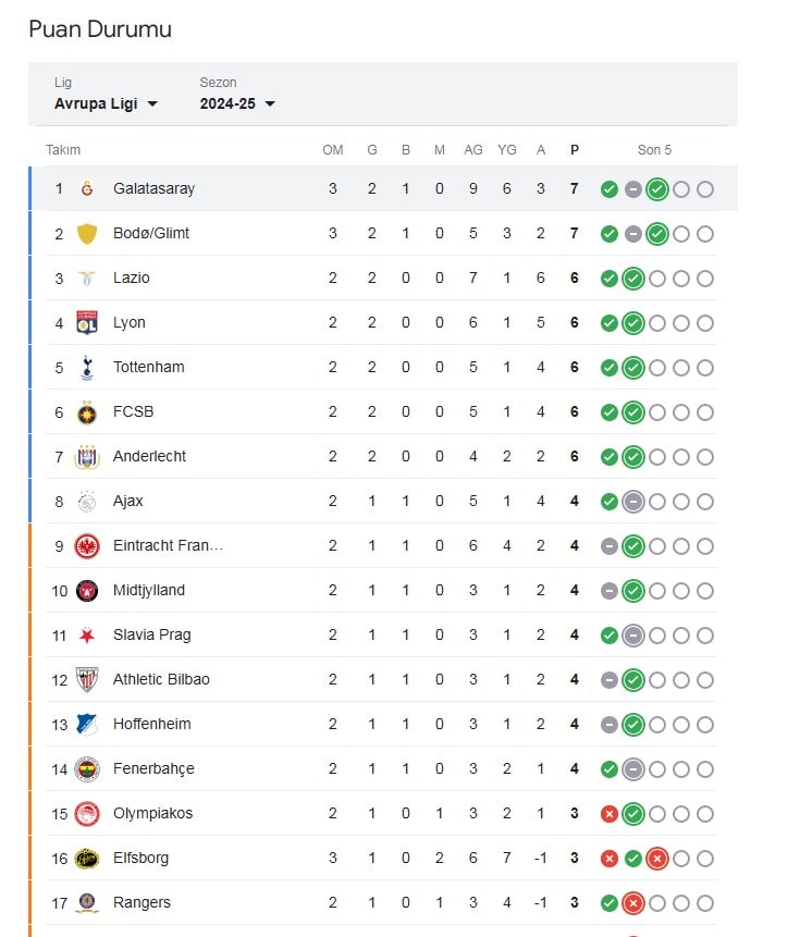 36 takımın yer aldığı Avrupa Ligi'nde Galatasaray, maç fazlasıyla 36 takım arasında lider konuma geldi.