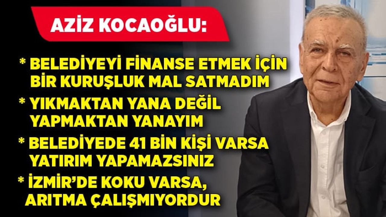 İzmir Büyükşehir Belediyesi’nin 2 bine yakın mülkünü sattığı resmi rakamlarla bilinirken, Aziz Kocoağlu kendi döneminde belediyeyi finansa etmek için bir kuruşluk mal satmadığını belirtti. Kocaoğlu, “Ben belediye başkanı olarak satmaktan yana değil almaktan yanayım. Yıkmaktan yana değil, yapmaktan yanayım. Son dönemde belediye binasının yıkılmaması gerektiği konusunda da beyanat verdim. Güçlendirme projesi yapılmıştı, yapan kişilerle görüşülmüştü, bina sağlamdı o bina soyulacaktı, güçlendirilecekti ve yenilenecekti. O bina kentin simge binalarından bir tanesiydi. O zaman da söyledim, o binanın yıkılması yanlıştı. Ben hala binanın yıkılmasının doğru olmadığını savunuyorum. Tabii ki baştaki başkanın tercihidir, saygı duymak gerekir. Hangi saikle yıkmıştır, bilemiyorum. Ama şunu söyleyebilirim; belediye İzmir'in sahibidir, belediye başkanı da İzmir'in sahibidir. Bu söylediğim laf çok farklı bir laf... Diğer makamlar temsilcidir, belediye başkanı tek seçilen kentlinin tek kişiyi seçerek verdiği oy sistemidir. Şehr-i emin denmesinin altında biz güvendiğimiz adama, bize sahip çıkacak, önderlik yapacak, bizim canımıza, namusumuza, malımıza sahip çıkacak adama oy veriyoruz düşüncesiyle belediye başkanı oy verdiği kişidir.” dedi.