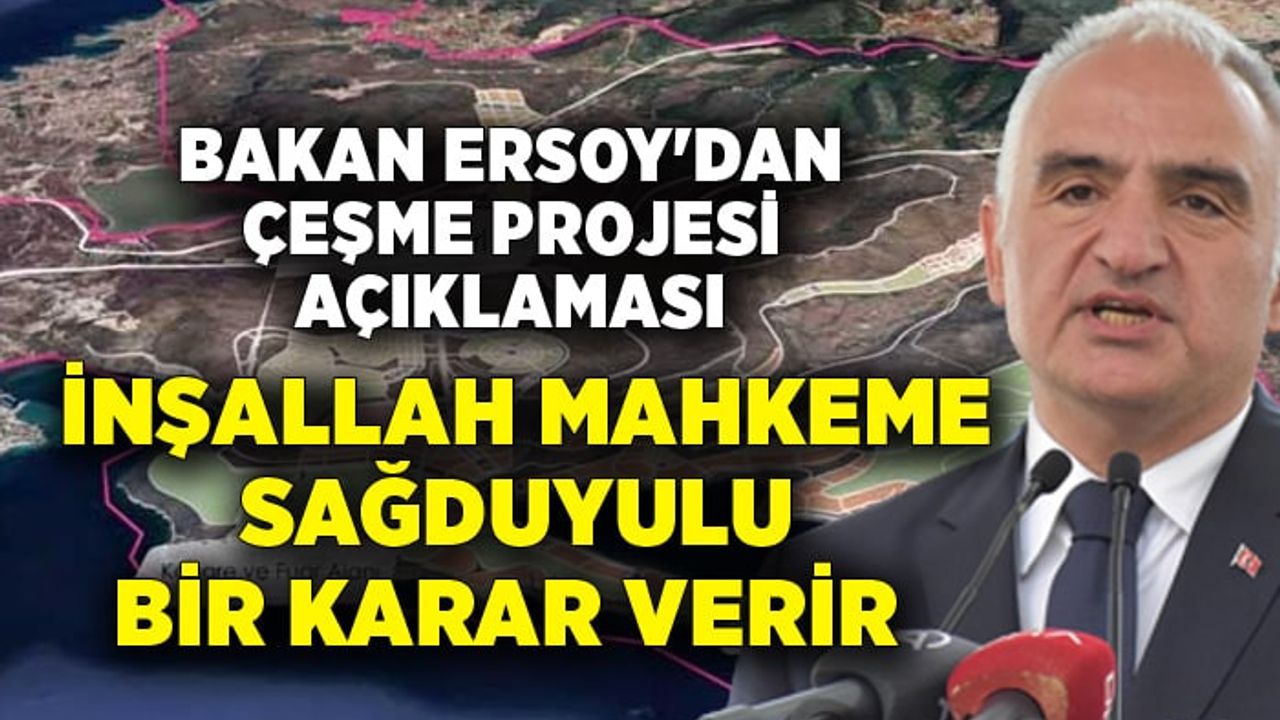 Kültür ve Turizm Bakanlığı tarafından hazırlanan Çeşme Projesi'yle ilgili soruyu da yanıtlayan Bakan Ersoy, "Geçici bir yürütme durdurma kararı var. Mahkemelerin asli kararını vermesini bekliyoruz. İzmir için hayati önemi olan bir proje. İzmir'in geleceği açısından önemli. Siyasi hedeflerle projenin algısının engellenmeye çalışılmasını doğru bulmuyorum. İzmir İstanbul Ankara ve Antalya gibi şehirler söz konusu olduğunda, konulara siyasi yaklaşmamalıyız. İzmir'in hava trafiğiyle ilgili bir sorunu var. İzmirlilere sorduğunuzda hep şikayet ediyorlar. Biz direkt dünyaya bağlanmak istiyoruz. İstanbul üzerinden bağlanmak istemiyoruz. Mesela bu proje o yönde atılmış en büyük adım olacak. Gerçekleştirildiğinde İzmir'e direkt sefer sayısında 10-15 kat artış göreceksiniz. Sektörün 12 aya uzadığı bir nokta haline gelecek, İzmir. Projenin hayati önemi var. Yürütmeyi durdurma kalkarsa plan askıya çıkacak. Bütün hassasiyetlerin ele alındığını ve gerekli düzenlemelerin yapıldığını göreceğiz. Cumhuriyet tarihinde bugüne kadar Kültür ve Turizm Bakanlığı tarafından çalışılmış en iyi turizm merkezi projesidir. Çünkü 9'dan fazla üniversitede 50'den fazla akademisyen katılımıyla, İspanya gibi yurt dışındaki temsilcilerin de görüşleri ve raporları alınarak hazırlanmış bir plandan bahsediyoruz. Bu nedenle hayati önemi var. İnşallah mahkeme sağduyulu bir karar verir ve İzmir, bu projeyi kazanır" ifadelerini kullandı.
