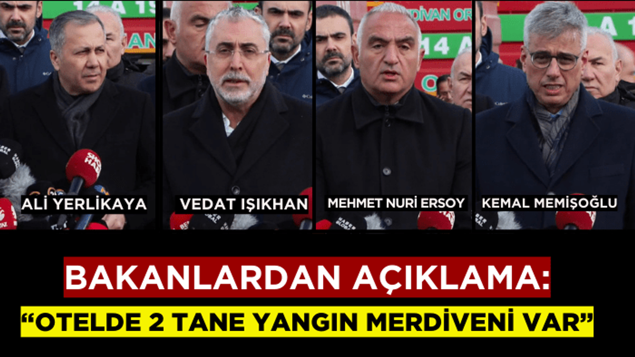 "Milletçe büyük bir acı içerisindeyiz. Bu sabah Bolu Kartalkaya'da bulunan bu otelde meydana gelen yangında maalesef 66 canımızı yitirdik, 51 yaralımız var. Çok üzgünüz. Yangın söndü. Soğutma çalışmaları devam ediyor. Soğutma çalışmalarının tamamlandığı yerlerde AFAD ve itfaiye ekiplerinin oda oda yapmış olduğu taramalardan şu ana kadar 66 canımızı yitirdiğimizi ifade ettik. Hayatını kaybeden vatandaşlarımızın ailelerine ve aziz milletimize başsağlığı diliyorum. Tedavisi devam eden vatandaşlara da acil şifalar diliyorum. Yangının meydana geldiği otel 12 katlı. Yangın anında otelde 238 kayıtlı misafir bulunuyor. Yangınla ilgili ilk ihbar saat 03.21'de alındı. Ekipler, direkt hareket geçti. Tüm ekiplerimiz tarafından ilk müdahale saat 04.15'te yapıldı. Şu an yangın söndürüldü. Soğutma çalışmaları devam ediyor. AFAD, İtfaiye, Orman Genel Müdürlüğü, İl Sağlık Müdürlüğü, Jandarma Arama Kurtarma, Kızılay, STK'lar, Bolu Belediyesi olmak üzere 156 araç ve 428 personel çalışma yapıyor. Çalışmalara Bolu, Düzce, Sakarya, Ankara ve Kocaeli'den itfaiye ve su tankeri katıldı. Arama kurtarma aracıyla beraber mobil haberleşme aracı da müdahale çalışmalarında yer alıyor. Otelin arka tarafının yamaç olması nedeniyle mücadele ancak ön ve yan cepheden gerçekleştirildi. 2 müfettiş görevlendirildi. 5 savcımız da burada bilirkişilerle beraber çalışmaya başladılar. Adli soruşturma başlatıldı. Sayın Cumhurbaşkanımız, buradaki çalışmaları anbean takip ediyor. Biz de kabine üyesi arkadaşlarımızla beraber buradayız. Vefat eden vatandaşlarımıza Allah'tan rahmet diliyorum. Yakınlarına, aziz milletimize başsağlığı diliyorum" dedi.