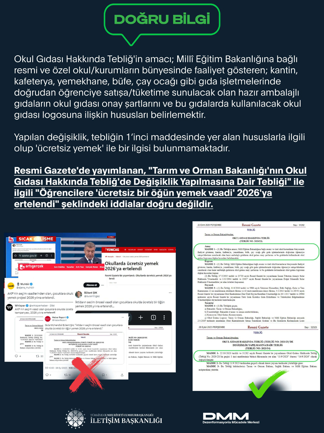 Dezenformasyonla Mücadele Merkezi'nin sosyal medya hesabından yapılan açıklamada, söz konusu iddianın doğru olmadığı belirtilerek, "Okul Gıdası Hakkında Tebliğ'in amacı; Milli Eğitim Bakanlığı'na bağlı resmi ve özel okul/kurumların bünyesinde faaliyet gösteren; kantin, kafeterya, yemekhane, büfe, çay ocağı gibi gıda işletmelerinde doğrudan öğrenciye satışa/tüketime sunulacak olan hazır ambalajlı gıdaların okul gıdası onay şartlarını ve bu gıdalarda kullanılacak okul gıdası logosuna ilişkin hususları belirlemektir. Yapılan değişiklik, tebliğin 1'inci maddesinde yer alan hususlarla ilgili olup 'ücretsiz yemek' ile bir ilgisi bulunmamaktadır" denildi.