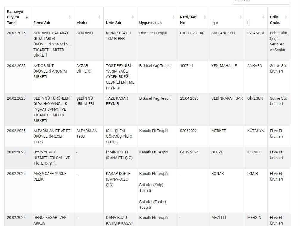 Bakanlığın yayımladığı listede, özellikle ‘Et ve Et Ürünleri’ kategorisinde yer alan bazı firmaların ürünlerinde ‘Tek Tırnaklı Eti’ tespit edilmesi nedeniyle uygunsuzluk bulunduğu açıklandı.