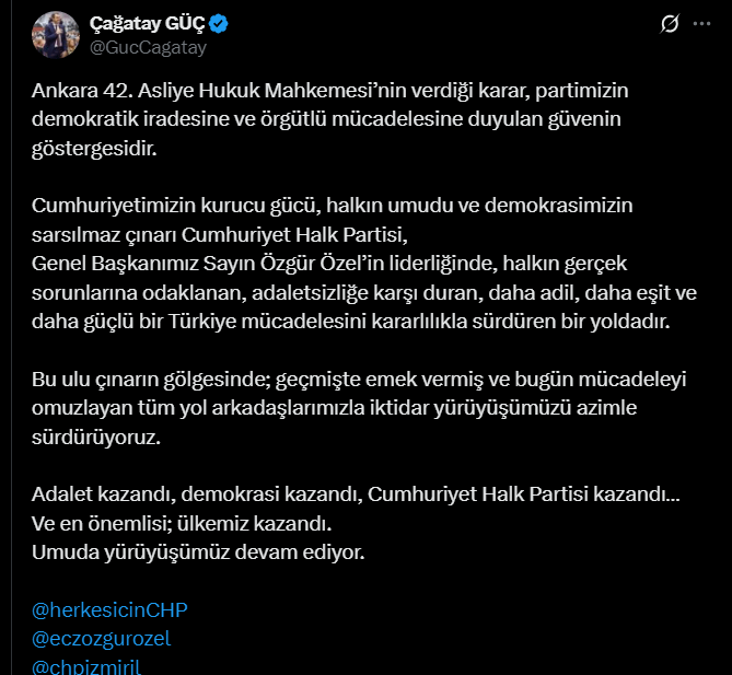 Ankara 42. Asliye Hukuk Mahkemesi’nin verdiği karar, partimizin demokratik iradesine ve örgütlü mücadelesine duyulan güvenin göstergesidir.