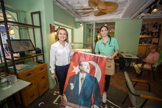 Alsancak'tan Göztepe'ye, Eşrefpaşa'dan İnönü Caddesi'ne ilçenin dört bir yanındaki esnafa bayrak verilirken, Konak Belediye Başkanı Nilüfer Çınarlı Mutlu da Alsancak esnafını ziyaret ederek Atatürk baskılı bayrak hediye etti. Esnaf ve vatandaşın yoğun ilgisiyle karşılaşan Başkan Mutlu, 19 Mayıs Atatürk'ü Anma Gençlik ve Spor Bayramı'nı kutlayarak, "Atamızın gençlere armağan ettiği 19 Mayıs'ın coşkusunu Konak'ın dört bir yanına yayacağız" dedi.