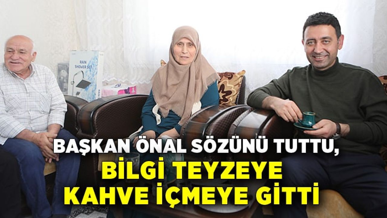 Başkan Önal, "Seçim çalışmaları kapsamında yaptığımız mahalle ziyaretleri esnasında Bilgi teyzemiz, beni bir mola vermek için kahve içmeye çağırmıştı. Ben de programlarımız esnasında kendisini arayıp, göreve seçildikten sonra ilk kahveyi içmeye geleceğime dair söz vermiştim. "Bir fincan kahvenin kırk yıl hatırı vardır" diyerek kendisini ve ailesini ziyaret ettim. Hem büyüklerimizin bayramını kutladık hem de sözümüzü yerine getirdik. Bundan sonra da verdiğimiz her sözü tutmaya devam edeceğiz" diye konuştu.