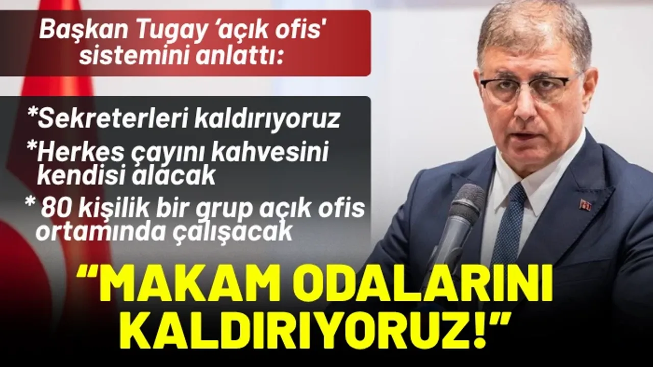 İzmir Büyükşehir Belediyesi’nin yeni dönemde açık ofis sistemine geçeceğini duyuran Başkan Tugay, “Yakında yeni bir uygulamamız olacak. İzmir Büyükşehir Belediye Başkanı, Genel Sekreter ile yardımcıları, daire başkanları, şirket genel müdürlerinden oluşan yaklaşık 80 kişilik bir grup olarak iki hafta içinde açık ofis ortamında çalışmaya başlayacağız. Makam odalarını kaldırıyoruz, sekreterleri kaldırıyoruz. Hepimize birden bakan birkaç sekreter arkadaş olacak. Hepimiz sadece bir salonda masalarda oturarak çalışacağız. Odacıları kaldırıyoruz. Herkes çayını kahvesini kendisi alacak. Bu, dünyada pek çok özel sektör kuruluşunun yaptığı bir uygulama. Arkadaşlarımızla konuştuk. Hepsinin rızasını aldık. Umuyorum başarılı oluruz. Umuyorum iyi bir örnek olarak anlatılır. Bu ve benzeri adımları atarsak daha mutlu, huzurlu, kendisini kuruma ait hisseden, o takıma daha fazla katkı veren kamu görevlileri oluruz diye düşünüyorum” ifadelerini kullandı.