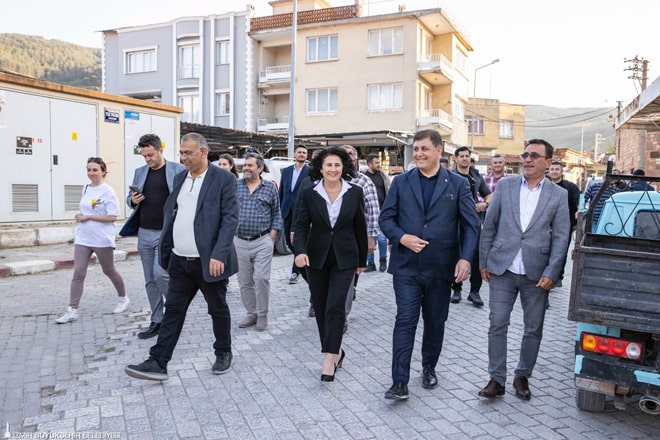 İlçe sakinlerinden Cemil Özcan ve Cemil Kaya, isim benzerliği nedeniyle Başkan Tugay'ı aralarına alarak fotoğraf çektirdi. O anlar çevrede bulunanları da gülümsetti. İlçede kadın girişimcilerin açtığı bir pastaneye de giren Cemil Tugay, kadınların yaptığı pastalardan satın aldı.