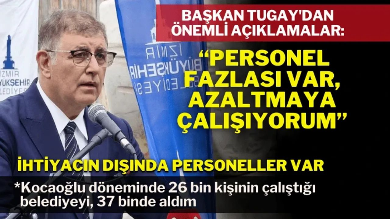 Başkan Tugay, Büyükşehir'den toplu işten çıkarılmalar olacağı iddialarına da yanıt verirken, “Böyle bir tutum, böyle bir karar yok. Ama genel anlamda bazı alanlarda, bazı şirketlerde ihtiyacın üzerine personel olduğu bir gerçek. Sayın Aziz Kocaoğlu, belediye başkanlığını bitirdiği gün, Büyükşehir Belediyesi'nin 26 bin çalışanı var. 26 bin çalışanla Büyükşehir Belediyesi'nin bütün hizmetleri yürüyor. Ben göreve geldiğim zaman 37 bin 700 civarında çalışanla yürüyor. Yani her çalışan maaşın ötesinde ayrıca vergi ve SGK yükü demek. Çünkü belediyenin bütün vergi borcu, SGK borcu olan çalışanların ücretlerinden geliyor. O nedenle çalışanların ihtiyaç fazlasını azaltmaya çalıştığımız doğru. Ama böyle bir toplu işten çıkarma gibi bir şeyimiz yok. Performans ve ihtiyaca bağlı olarak doğru düzgün bir personel rejimi yürütmeye çalışıyoruz. Ben de zaman içerisinde personel sayısını arttırmaya değil, azaltmaya çalışacağım dedim. Başladığımızdan bugüne kadar zaten önemli bir fark ve azalma oldu. İhtiyaç olduğu zaman çalışan bütün arkadaşlarımız zaten başımızın üstünde. Ama bir performans problemi varsa, disiplin problemi varsa, zaten emekli olarak ayrılanlar da çok oluyor. Onların yerine kurum içerisinde farklı pozisyonlarda görevlendirerek bu işi sürdüreceğiz” şeklinde açıklama yaptı.