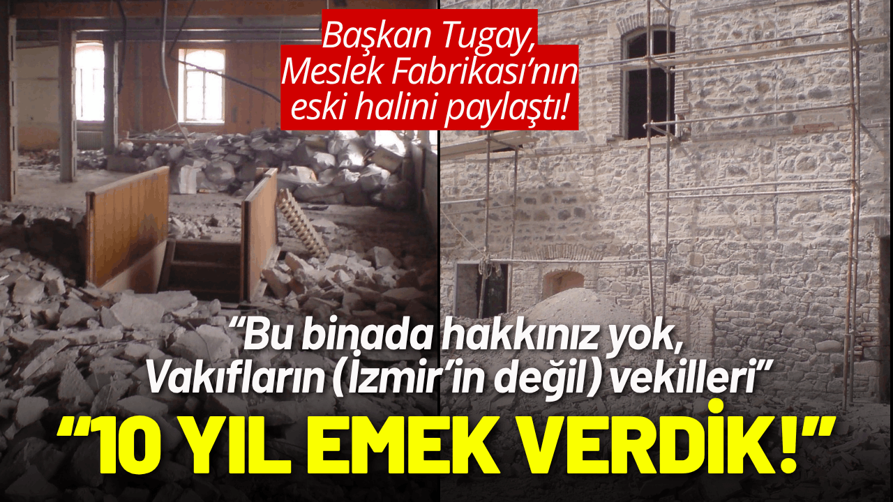 İzmir Büyükşehir Belediye Başkanı Cemil Tugay, Meslek Fabrikası'nın 10 yıl önceki halini paylaşırken, "Belediye personeliyle parasıyla 10 yıl emek ve kaynak harcamış bu hale getirmek için. Vakıflar mı yaptı bu işi?" diye sitem etti.