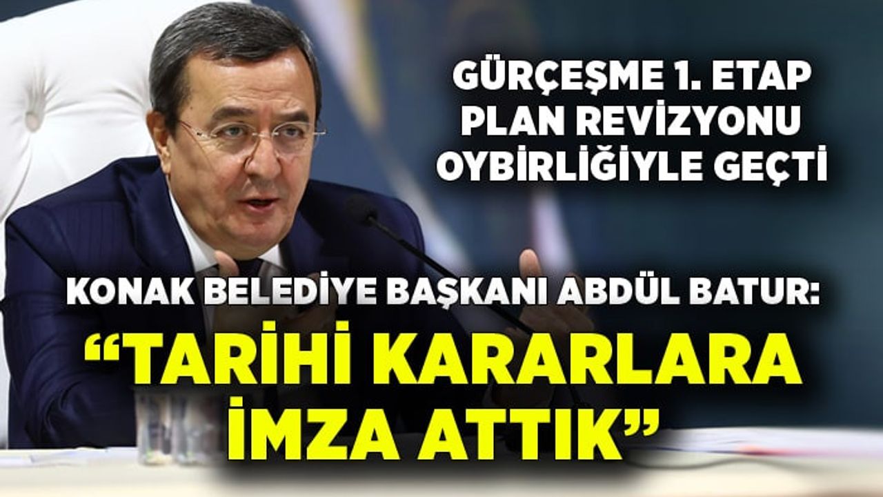 Konak Belediye Meclisi, aralık ayının ilk toplantısını Selahattin Akçiçek Kültür Merkezinde gerçekleştirdi. Tarihi bir kararın daha oybirliğiyle alındığı toplantıda Gürçeşme 1. Etap Uygulama İmar Planı Revizyonu tüm meclis üyelerinin kararıyla kabul edildi. Meclis oturumunu yöneten Konak Belediye Başkanı Abdül Batur, Bu kentin görünümünü değiştirme noktasında, hepimiz elimizi taşın altına soktuk. Ben altını bir kez daha çiziyorum. Yaptığımız işi küçümsemeyelim. Yapılan iş çok büyük bir iş, tarihe geçecek bir iş" dedi.