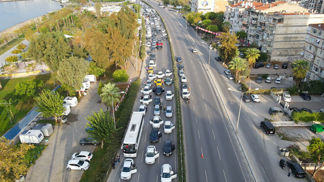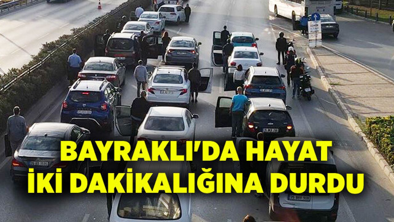 Saatler 09.05'i gösterdiğinde ise Bayraklı'da hayat durdu! Hem tören alanındakiler, hem balkonlardaki vatandaşlar hem de cadde ve sokaklardaki araç sürücüleri, Büyük Önder'in aramızdan ayrıldığı anda iki dakikalık saygı duruşuna geçti. Siren ve korna sesleri ilçenin dört bir yanında yankılandı. Anadolu Caddesi'ni kullanan tüm sürücüler iki dakika boyunca kontak kapattı. Ortaya eşsiz görüntüler çıktı. Belediye çalışanları da ana bina bahçesindeki Atatürk heykeli önünde saygı duruşunda bulundu.