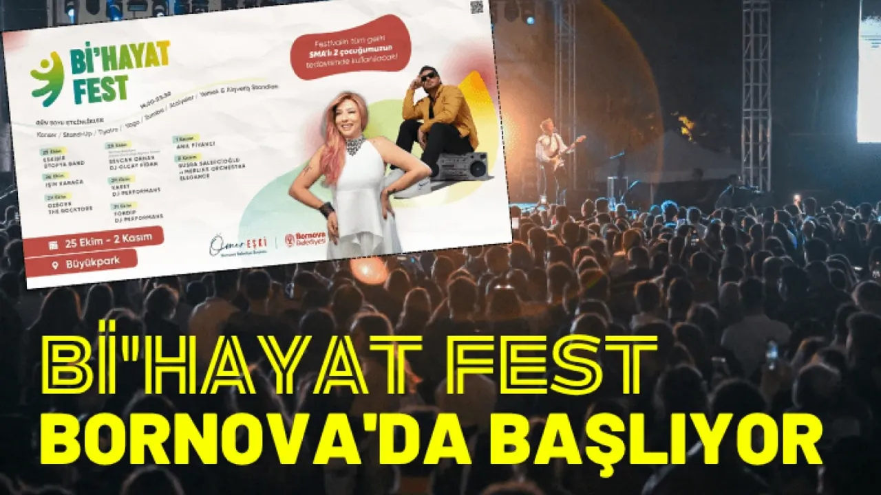 Bornova Belediyesi'nin düzenlediği "Bi'Hayat Fest", 25 Ekim – 2 Kasım 2025 tarihleri arasında Büyükpark'ta gerçekleşecek. Konserler, tiyatro, yoga, zumba, atölyeler ve lezzetli stantlarla dolu festivalin tüm geliri, SMA hastası iki çocuğun tedavisine destek olmak için kullanılacak.