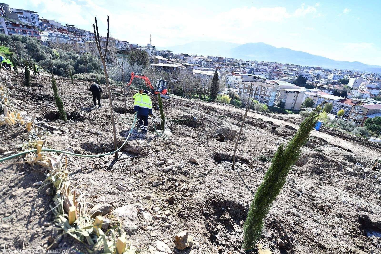 Alanda dikim çalışmalarının devam ettiğini belirten İzmir Büyükşehir Belediyesi Park ve Bahçeler Dairesi Başkanlığı Ağaçlandırma Şefi Fuat Karaca, “İzmir Büyükşehir Belediye Başkanımız Dr. Cemil Tugay’ın kent genelinde başlattığı ağaçlandırma seferberliği kapsamında bu alanı ele aldık. Öncelikle eğimi düşürecek, su tasarrufu sağlayacak arazi hazırlıklarını yaptık. Bunun için terasları ve dikim çukurlarını belirledik. Binin üzerinde ibreli ve yapraklı olmak üzere karışık ağaç dikimi yapacağız. Yapraklı türlerden yalancı akasya, tespih, sofora, akça ağaç, ibreli türlerden de toprak yapısına uygun olan kalem serviyi kullanacağız. Alanı aynı zamanda çeşitli bitki türleri ile yeşillendireceğiz. Kente yeni akciğerler kazandırırken buradaki boş alanda kaçak moloz dökümünün önüne geçiyoruz. Halkımızın da bu yönde talepleri vardı, onlar da çalışmalardan çok memnun” dedi.