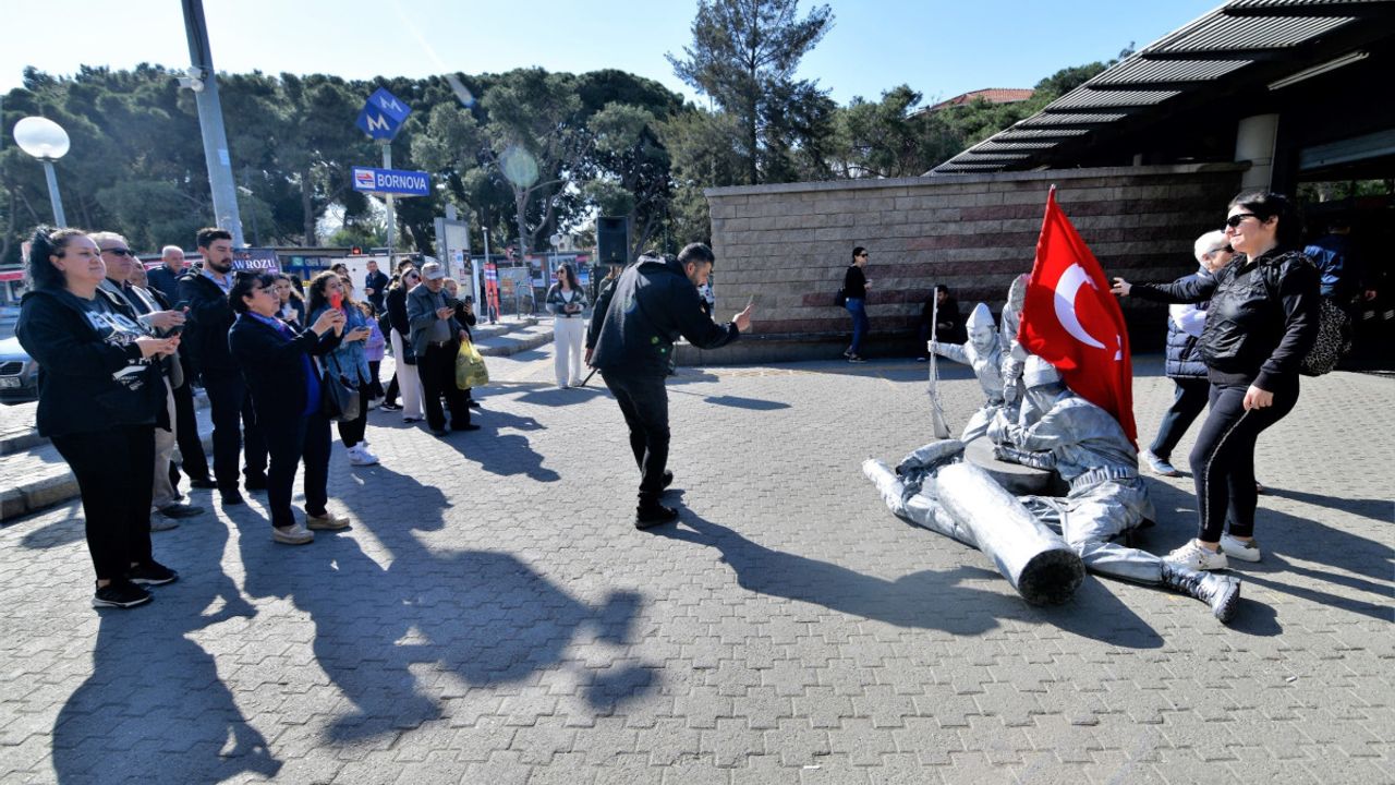 Bornova Metro İstasyonu çıkışında sahnelenen canlı heykel performansı, vatandaşlardan büyük ilgi gördü. Vatandaşlar Çanakkale Savaşı'ndan sahneleri canlandıran heykellerle hatıra fotoğrafları çektirdi.