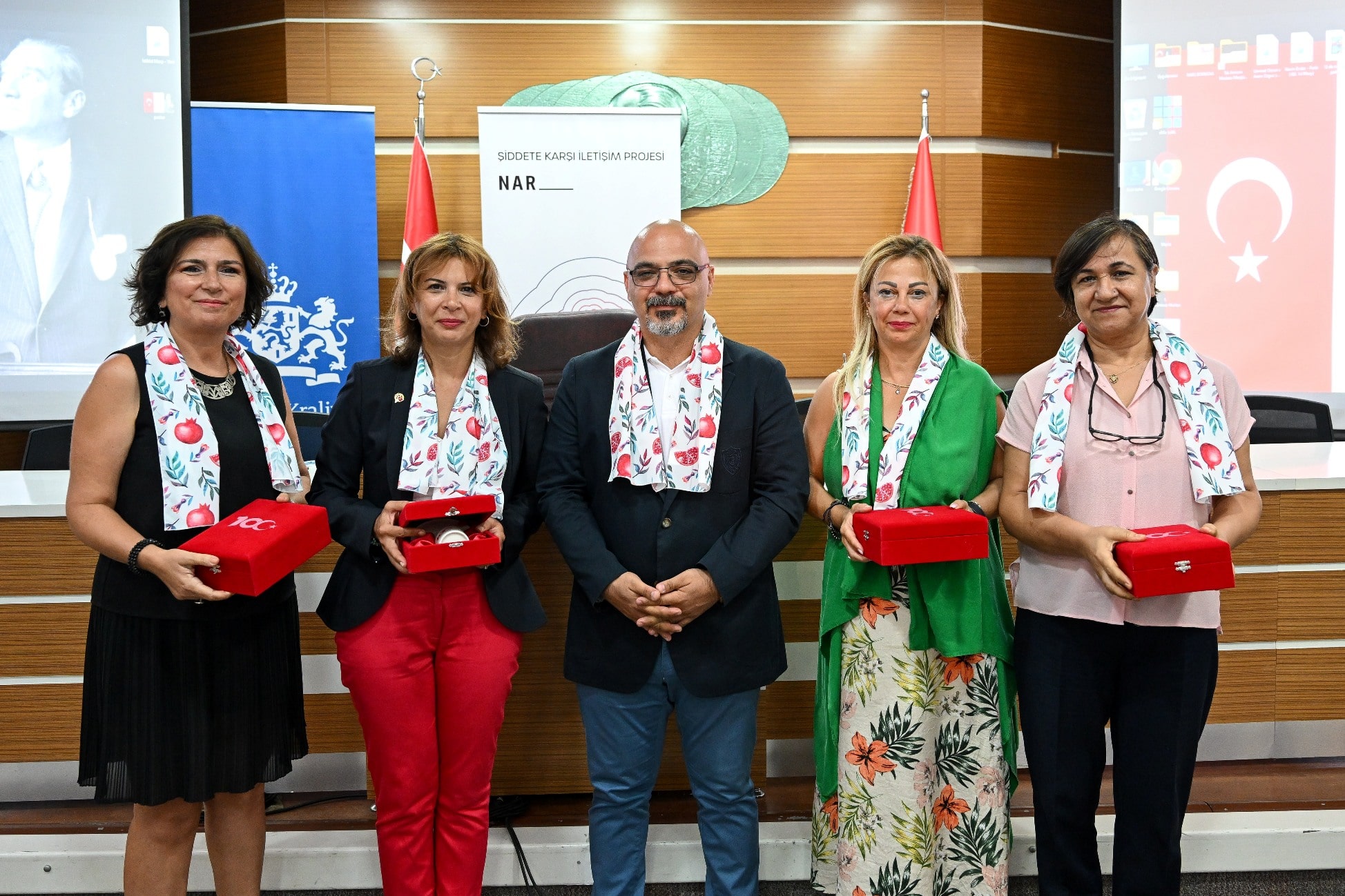 Bornova Belediye Başkan Yardımcısı Cem Arıkan Proje Koordinatörü Reyhan Şenay, Sosyal Hizmet Uzmanı Dilek Yücel Aksoy, İGC Nar Projesi Eğitmeni Birgül Ayman Güler ve İzmir Gazeteciler Cemiyeti Başkanı Dilek Gappi'ye birer teşekkür plaketi verdi.