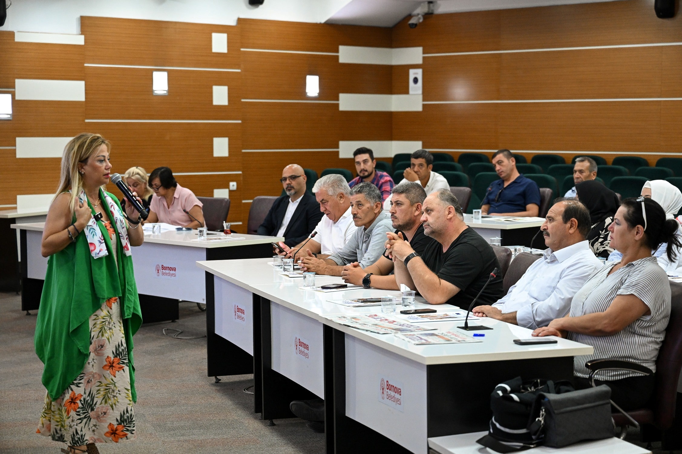 Muhtarlar Buluşması kapsamında, Sosyal Hizmet Uzmanı Dilek Yücel Aksoy ve İGC Nar Projesi Eğitmeni Birgül Ayman Güler, kadına yönelik şiddetin önlenmesi ve sonrasında atılabilecek adımlarla ilgili sunum yaptı.