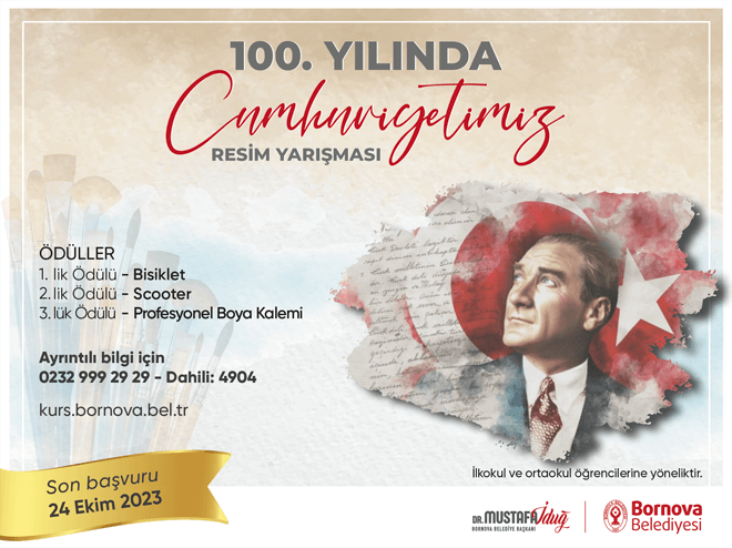 Bornova Belediye Başkanı Dr. Mustafa İduğ, Bornovalı miniklere düzenledikleri resim yarışması davet ederek, "Cumhuriyetimizin 100. kuruluş yılını hep birlikte, coşkuyla kutlamak unutulmaz kılmak için etkinlikler hazırlıyoruz. Çocuklarımız için düzenlediğimiz bu yarışma ile onlara Cumhuriyet sevgisi aşılamak ve ülkemizi ikinci 100 yıla onların taşıyacağı bilincini öğretmek stiyoruz"dedi.
