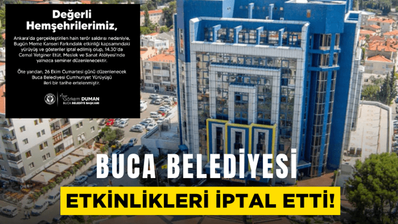 Buca Belediyesi, Ankara’da Türk Havacılık ve Uzay Sanayii A.Ş (TUSAŞ) Tesisi'nde gerçekleşen hain terör saldırısı nedeni ile 26 Ekim tarihine kadar olan tüm etkinliklerini iptal ettiğini duyurdu. Buca Belediyesi’nden yapılan açıklamada şu ifadelere yer verildi:
