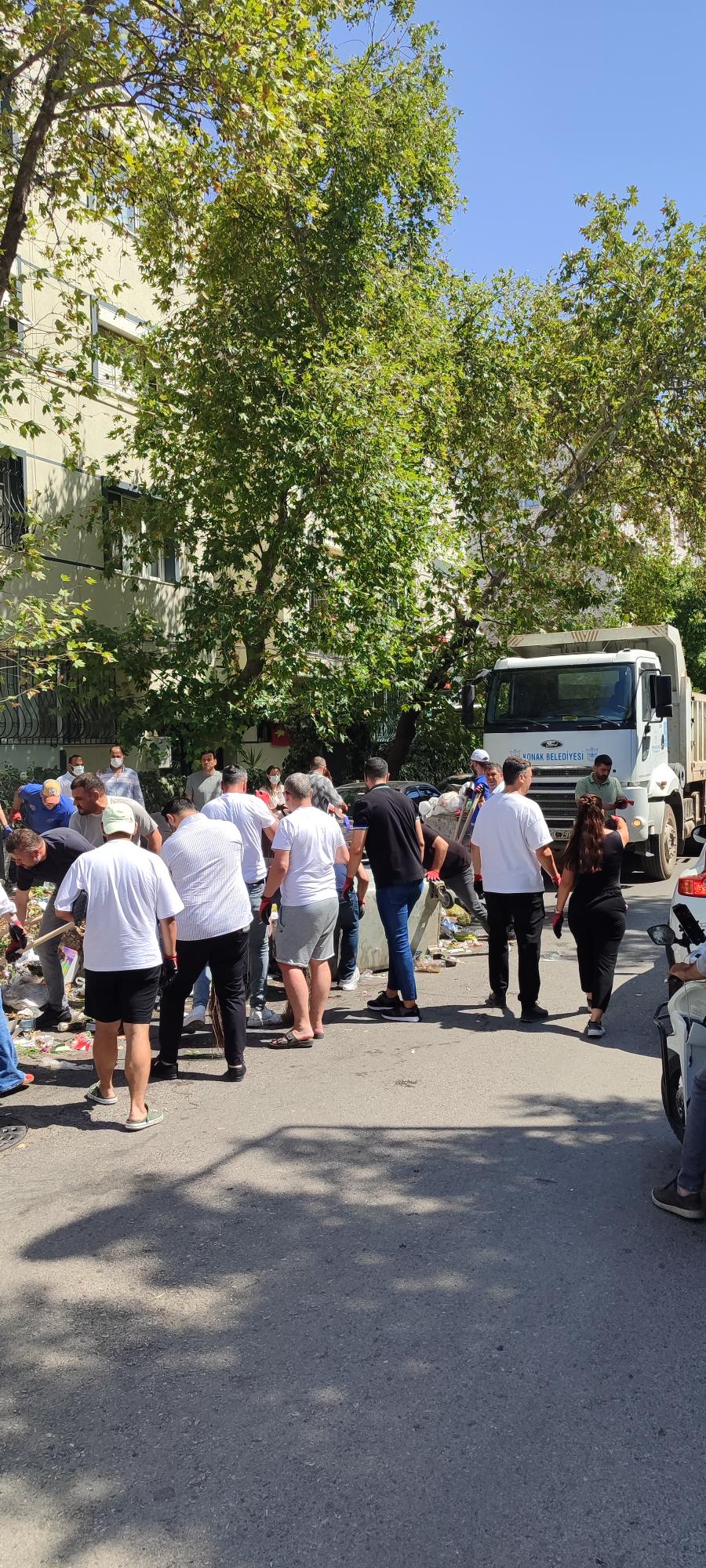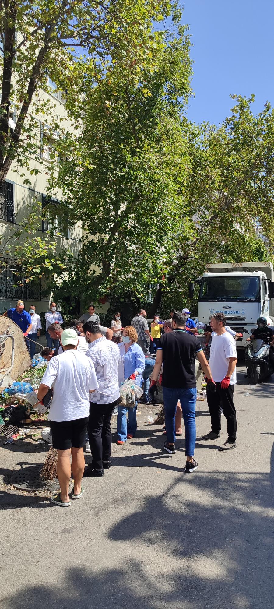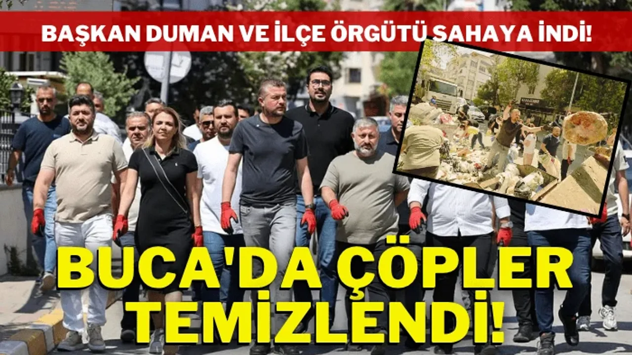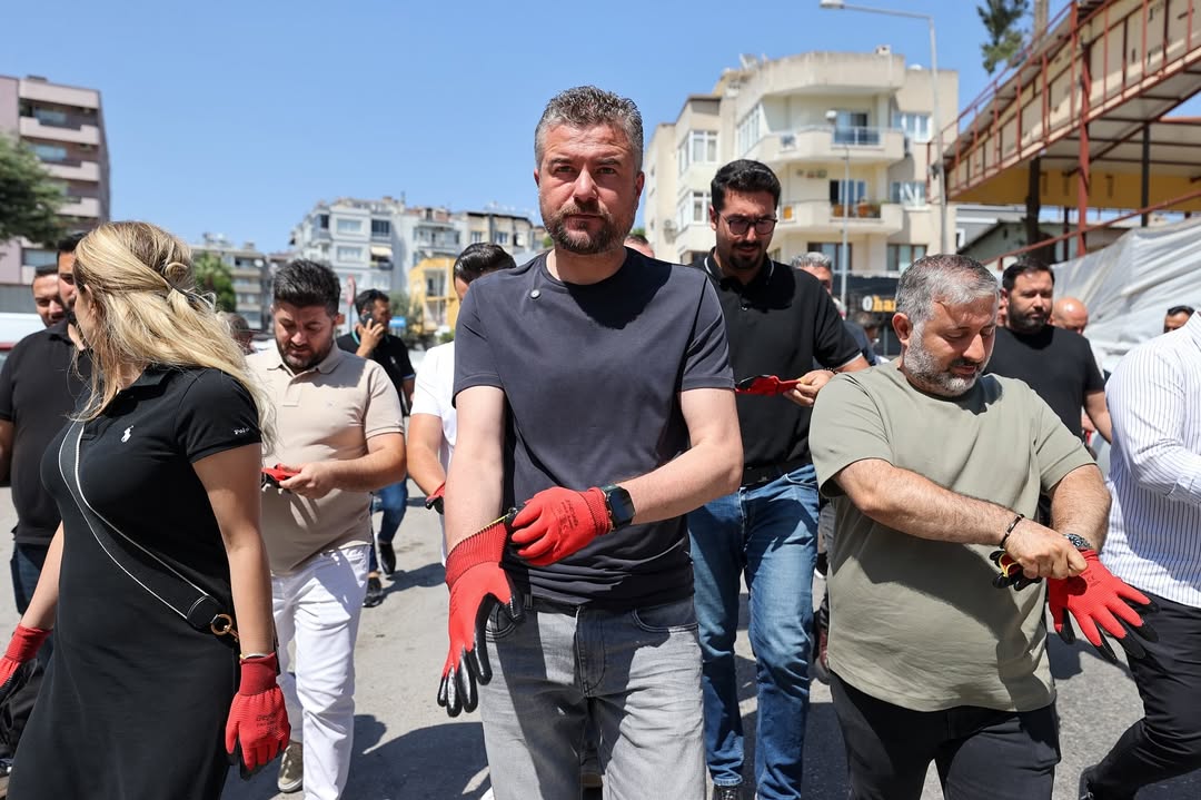 Buca Belediye Başkanı Görkem Duman ve CHP ilçe Başkanı Çağda Kaya, meclis üyeleri, bürokratlar, muhtarlar ve bir grup işçi ile çöpleri topladı.
