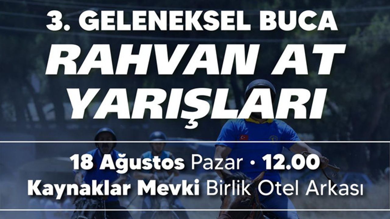Buca Belediyesi ve Buca Rahvan Atlı Spor Kulübü iş birliğiyle 18 Ağustos Pazar günü saat 12.00'de Kaynaklar Sebze ve Meyve Hali yanında 3. Geleneksel Buca Rahvan At Yarışları düzenlenecek. Organizasyonda atlar, ikili tay, üçlü tay, dörtlü tay, taze beşli, deste, küçük orta, büyük orta, baş altı, baş atlar ve ithal A grubu olmak üzere toplam 10 kategoride yarışacak.