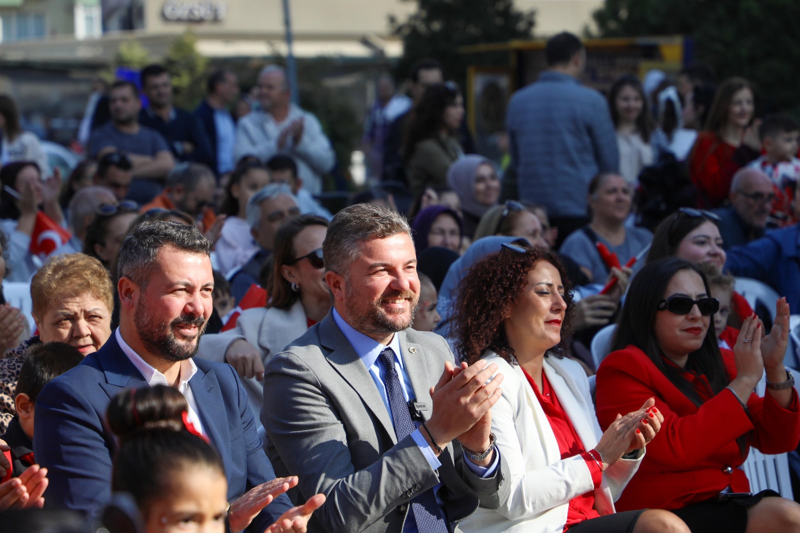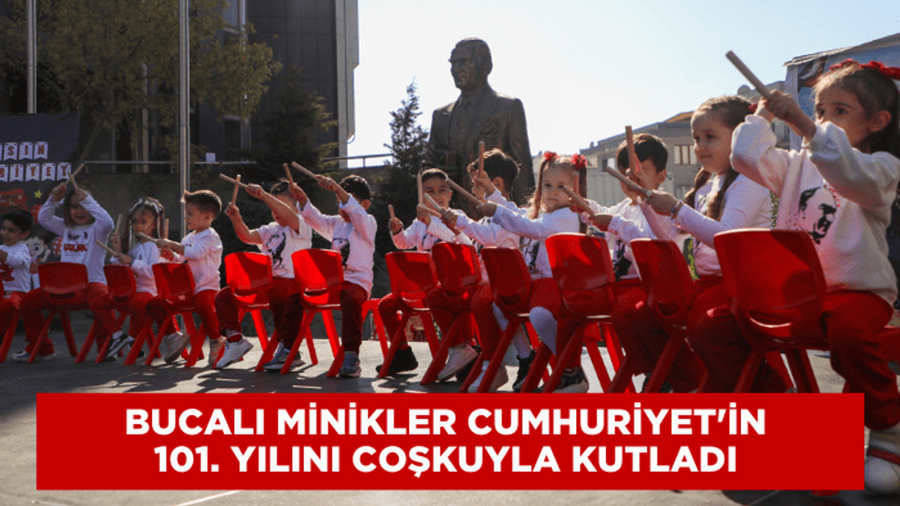 Buca'da Cumhuriyet Bayramı'nın 101. yılı kapsamında düzenlenen kutlamalar devam ediyor. Buca Belediyesi iştirakı BUCAMAR'ın Vali Rahmi Bey, Betontaş ve Çamlıkule Çınar Anaokulları'nda eğitim gören minikler, Cumhuriyet Bayramı'nı coşku içerisinde kutladı. Buca Belediyesi'nin ana hizmet binası önünde gerçekleştirilen törende birbirinden güzel performanslar sunan öğrenciler, en büyük alkışı Buca Belediye Başkanı Görkem Duman'dan aldı.