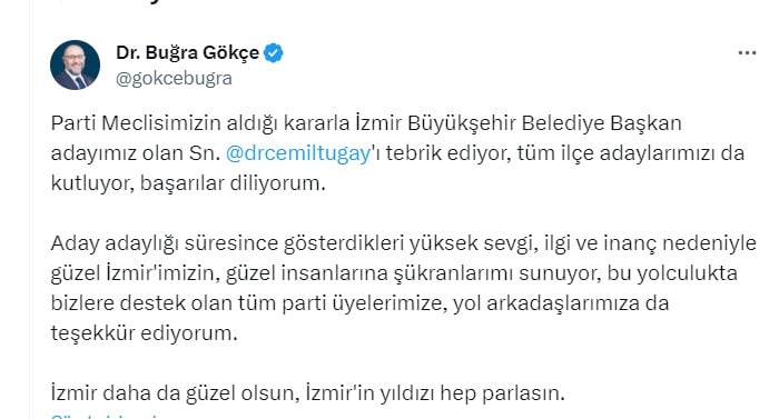 İzmir Büyükşehir Belediye Başkan Aday Adayı Buğra Gökce, büyükşehir adayı olan Cemil Tugay'a sosyal medya hesabından tebrik mesajı yayınladı.