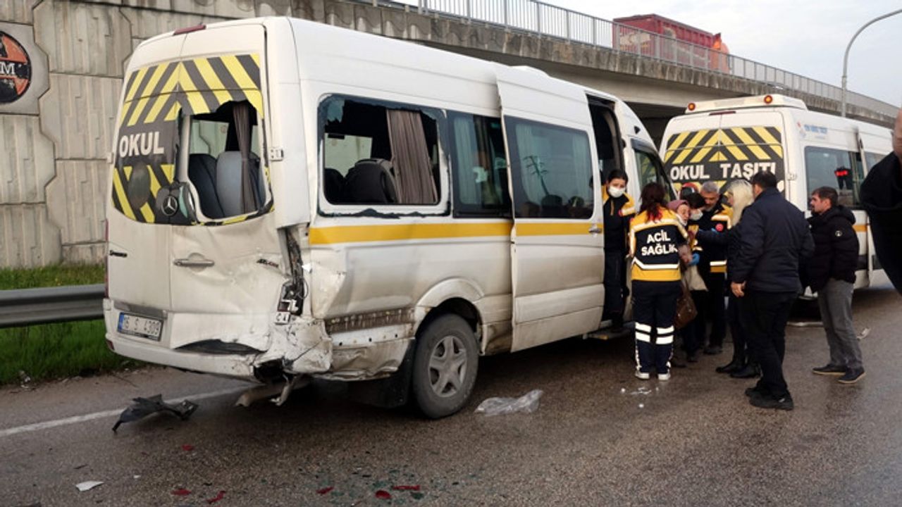 BURSA'da, fabrika işçilerini taşıyan 3 servis minibüsünün karıştığı zincirleme kazada, 15 kişi yaralandı.